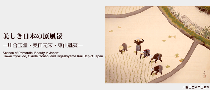 自然を飽くことなく凝視し、「肉眼で見るのではなく、心眼で描く」ことに努めた川合玉堂(1873-1957)。「人間の心の象徴」としての風景を描き、「風景自体が人間の心を語っている」という言葉を残した東山魁夷(1908-1999)。そして、幼少時の原体験から自然の移り変わりに惹かれ、「半心半眼」で見た自然を、鮮やかな色彩で描き続けた奥田元宋(1912-2003)。彼らの描く風景は、どこかなつかしく、心を落ち着かせる魅力を持っています。それは、かつては確かに存在し、いつかどこかで目にした日本の旧(ふる)き良き姿、美しい自然観や穏やかな詩情があふれる心のふるさとの姿です。