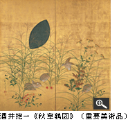 300年におよぶ泰平の世を謳歌した江戸時代は、それまでの貴族や武士中心に発展してきた日本文化を、一気に庶民のレベルにまで押し広げ、多様性と厚みをもたらしました。当館の江戸絵画コレクションは、数としてはさほど多くはありませんが、うち2点が重要文化財、3点が重要美術品であり、江戸絵画史上、重要な位置を占める画派と画家が揃っています。なかでも、酒井抱一《秋草鶉図》をはじめとする琳派の優品が数多く含まれていることは、注目に値するでしょう。当館創立者・山﨑種二の美術品を蒐集するきっかけが、小僧時代に見た抱一の赤く熟した柿の絵の美しさであったというエピソードからも、彼の抱一への思いの強さが偲ばれます。