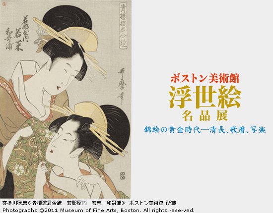 本展覧会では、この膨大な作品群から、錦絵の黄金時代と言われる天明・寛政期(1781―1801)に焦点をあて、清長・歌麿・写楽の3人の絵師を中心とした選りすぐりの作品をご紹介いたします。出品作品のほとんどがボストン美術館に収蔵されて以来、初めての里帰りとなります。本展覧会終了後は、ボストン美術館内でも5年間は展示されることがないといわれる浮世絵の名品の数々を、この機会にぜひお楽しみください。