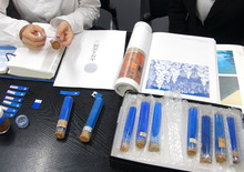 日本画には、鉱石を砕いて作られる岩絵具が使用されています。藍銅鉱(アズライト)を原石とする群青は、その中でも産出量が少なく、高価であるため宝石のような絵具といわれます。