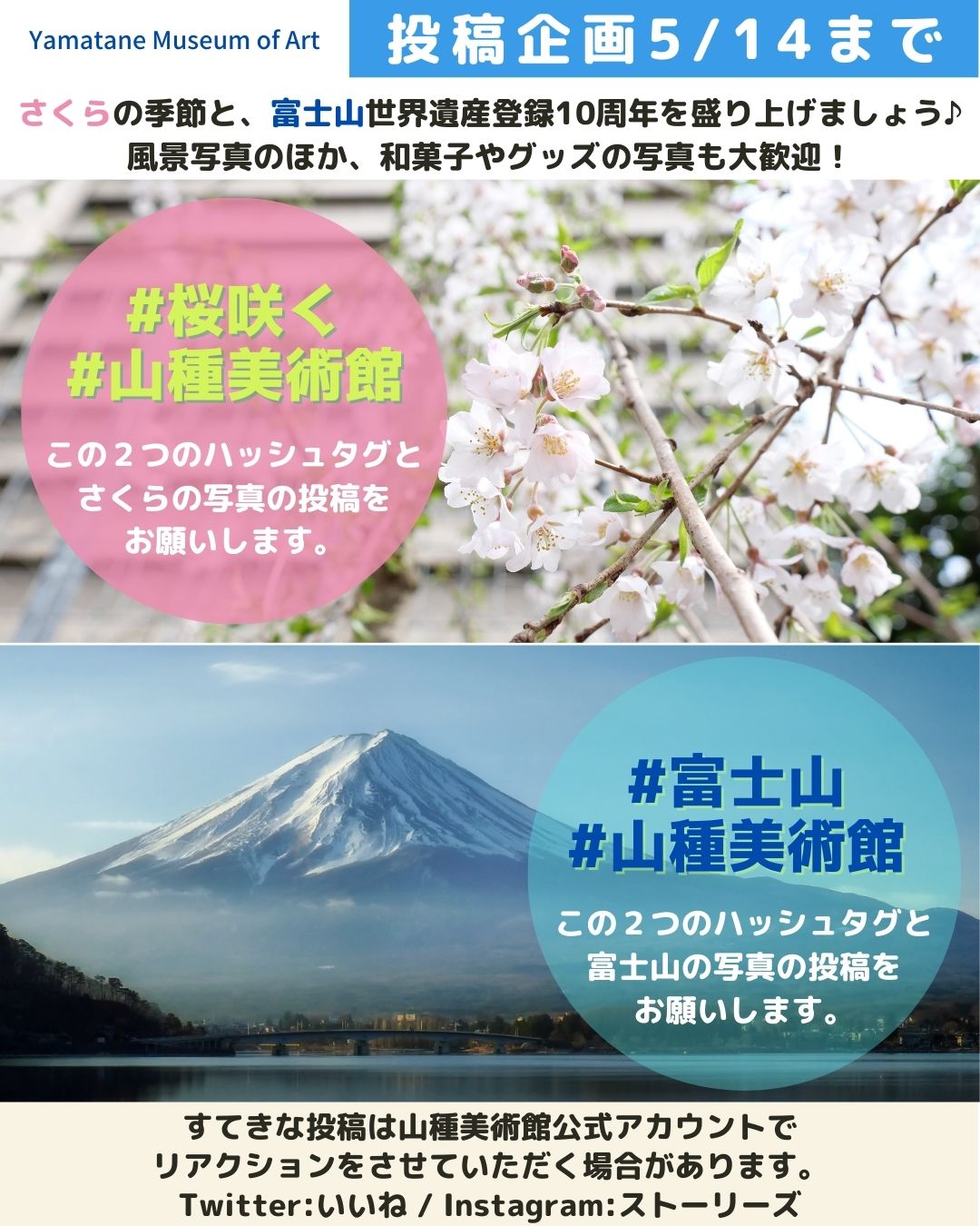 応募期間: 2023年3月11日(土)~5月14日(日) 応募方法: Twitter または Instagram でハッシュタグ 「#桜咲く #山種美術館 」または、「#富士山 #山種美術館 」をつけて写真を投稿すれば応募完了です。