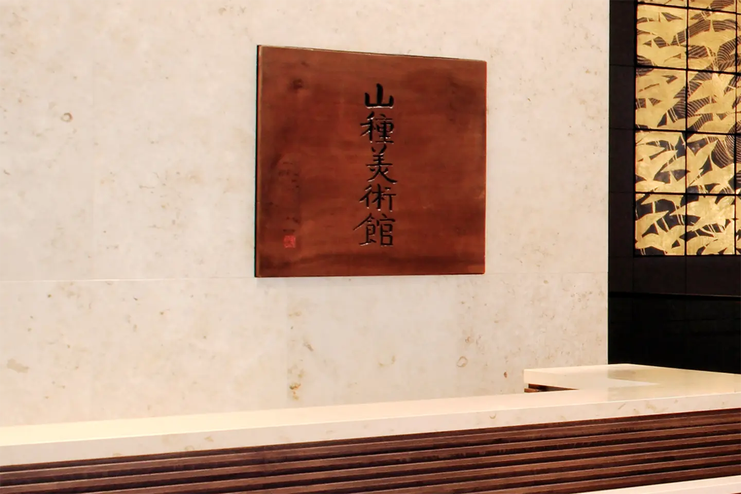 「山種美術館」のロゴは、歴史や文学を題材にした人物画で有名な日本画家、安田靫彦(1884-1978)が揮毫したものです。日本や東洋の古美術を研究し、理知的な構図と典雅な色彩、そして緊張感ある線描によって独自の芸術を開花させた靫彦ならではの書が、40数年にわたり山種美術館の入口を飾ってきました。初代館長の山崎種二が格別の想いをもって揮毫を依頼し、美術館のために書いていただいたこの文字を彫った看板は、エントランスと地下展示室入口で皆様をお迎えします。