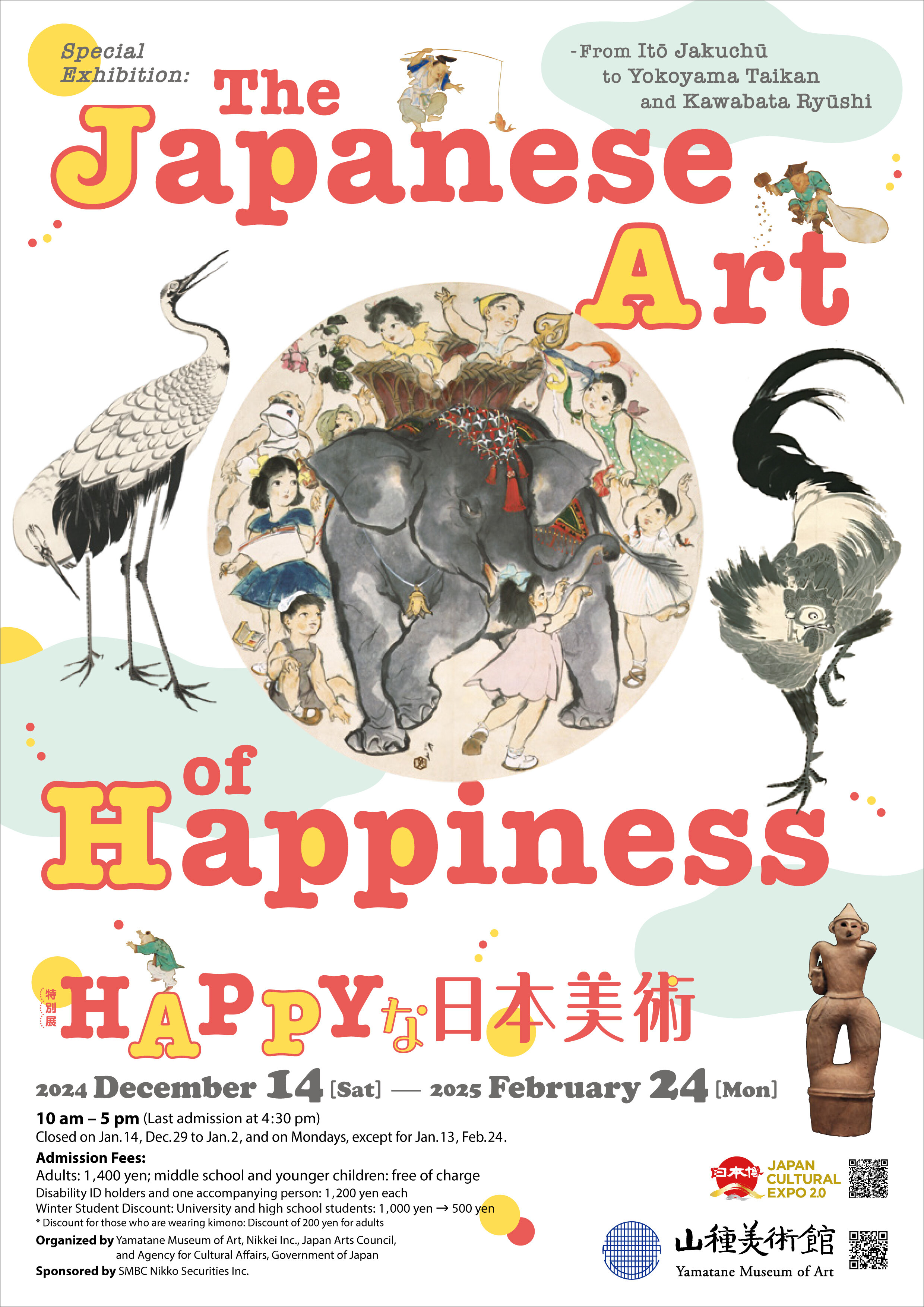 People have, since we first walked the earth, wished for happy lives. Japanese art presents a cornucopia of auspicious designs expressing that wish to adorn births, weddings, and other happy events, seasonal festivals, and everyday life. Amidst the unstable world situation we continue to experience nowadays, the Yamatane Museum of Art is delighted to present an exhibition full of happy feelings, expressing our hope for the happiness of all.