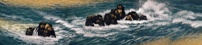 なかでも、昭和43年に新築された皇居宮殿のために描かれた《朝明けの潮》(宮内庁)は、日本の伝統的なやまと絵に見られる自然美と装飾美を併せ持った作品として高い評価を得、当時、この作品を目にする機会を得た当館初代館長の山﨑種二の心をとらえました。種二は、宮殿の絵画をひろく人々が鑑賞することができるようにと、同趣作品の制作を直接画家たちに依頼しました。こうして、揮毫された全長9メートルに及ぶ魁夷の《満ち来る潮》をはじめ、橋本明治《朝陽桜》、上村松篁《日本の鳥・日本の花》などの作品群は、現在では山種コレクションの中でも重要な位置をしめています。本展では、これら皇居宮殿ゆかりの絵画の一挙公開に加え、「京洛四季」連作の《年暮る》(山種美術館)、《夏に入る》(市川市東山魁夷記念館)、《北山初雪》(川端康成記念会)、さらには白い馬が象徴的な《春を呼ぶ丘》(長谷川町子美術館)など日本各地を描いた魁夷の代表作を集めて展示します。