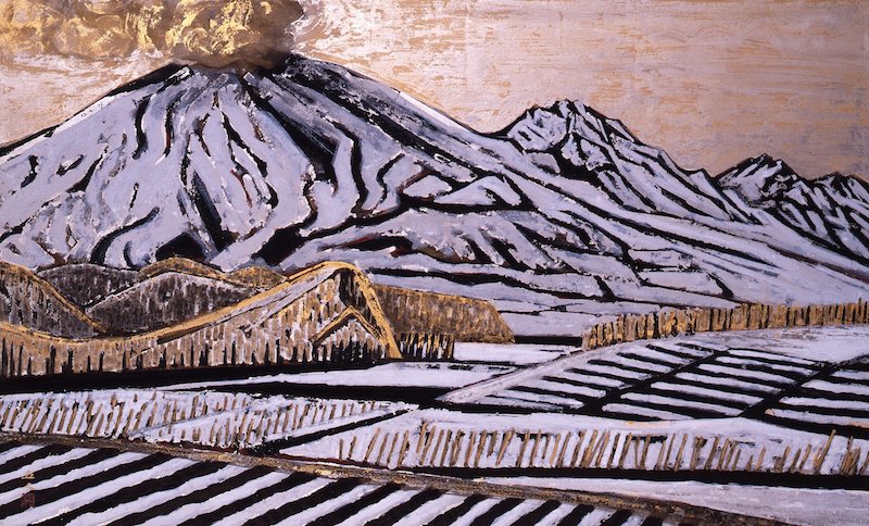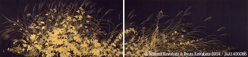 横山大観(1868-1958)は、柔和な光の表現を求め、金箔を裏面に用いた特殊な和紙で《喜撰山》(山種美術館)を完成させました。また、速水御舟(1894-1935)は、金砂子を敷き詰める「撒きつぶし」の技法で《名樹散椿》【重要文化財】(山種美術館)の空間を表現し、川端龍子(1885-1966)は、平安の紺紙金泥経に着想を得て、紺地に金を対比させた《草の実》(大田区立龍子記念館)を制作しました。戦後になると、金と銀の表現は新たな局面へと向かいます。山本丘人(1900-1986)は、斬新な手法により、金銀の箔や泥(でい)に対する新たなアプローチを行いました。一方、加山又造(1927-2004)は、金銀の素材の可能性を追求しながら、古典的な様式と現代的な感覚を融合させた作品世界を生み出しています。