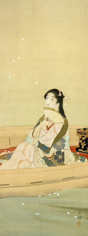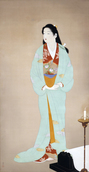 「西の松園、東の清方*2」と並び称され、清らかで端正な女性像を手がけた松園は、近代日本画を代表する重要な存在として位置付けられています。1890(明治23)年、皇室による日本美術の保護と作家の制作奨励のため帝室技芸員制度が設けられ、1944(昭和19)年までに79名が任命されました。松園もその一人であり、男性作家が大半を占める中でその栄誉を受けたことは、女性の社会的な立場や活動の場が限られていた時代ながら、画家として高く評価されていたことを示しています。