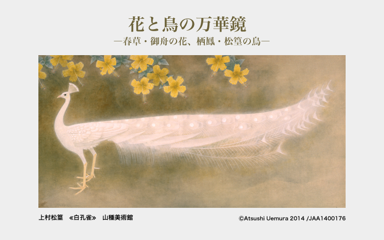 本展では、花の表現に新たな技法で挑んだ菱田春草《白牡丹》や速水御舟《翠苔緑芝》、鳥の姿を徹底した観察に基づき描写した竹内栖鳳の《みゝづく》や上村松篁《白孔雀》など、当館所蔵の優品を選りすぐって紹介いたします。四季折々の自然に注がれた画家たちのまなざしや花と鳥に込められた人々の思いに触れるとともに、伝統の中で磨かれてきた多彩な花と鳥の表現をご堪能ください。