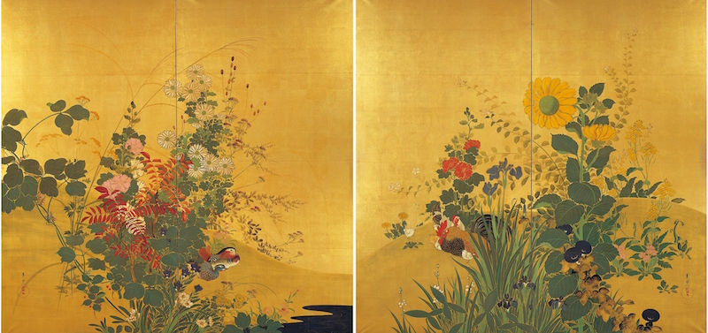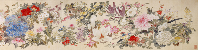 古来、花と鳥は自然の美しさの象徴として親しまれ、それらを慈しむ心情が文学や美術などを通じて表現されてきました。特に絵画では、色や形だけではなく花の咲いて散るさま、鳥の動く姿もモティーフとして描かれています。また、花鳥が独立した画題となってからは、屏風などの大画面では春夏秋冬の花と鳥が集う華麗な四季花鳥図が好まれ、一方で小画面では花びらや鳥の羽の一枚一枚に至るまで緻密に描き込んだ花鳥画も 人気を博しました。写生に基づいた写実的な作風から、構図や色彩に工夫を凝らした装飾性豊かな作風にいたるまで、バラエティに富んだ花鳥画が現代も数多く生み出されています。