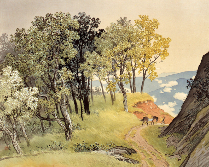 愛知に生まれ、岐阜で育った玉堂は、14歳で京都の画家・望月玉泉(もちづきぎょくせん)に入門。画壇デビューを果たした17歳から同じ京都の幸野楳嶺(こうのばいれい)に師事しました。1896(明治29)年には23歳で京都から東京へ移り、橋本雅邦(はしもとがほう)のもとでさらなる研鑽を積んでいきます。若い頃から好んで風景を描いた玉堂は、円山四条(まるやましじょう)派の基礎の上に、雅邦が実践した狩野(かのう)派の様式を取り入れ、さらに各地を訪ねて実際の景色に触れることで、伝統的な山水画から近代的な風景画へと新たな境地を拓いていきました。また、官展で審査員をつとめ、帝国美術院会員となる一方、東京美術学校教授、帝室技芸員に任ぜられるなど、東京画壇における中心的な役割を果たし、1940(昭和15)年には文化勲章を受章しています。戦後は、疎開先の奥多摩にとどまって晩年を過ごし、大らかで温かみのある画風を展開させました。