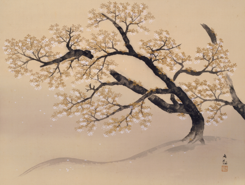花の画題には、鳥や虫、人物との組み合わせなど、多彩なバリエーションがあり、季節の情趣を感じさせながら私たちの目を楽しませてくれます。江戸時代の琳派の絵師・酒井抱一は、月夜の梅を描いた《月梅図》、菊に瑠璃鶲を配した《菊小禽図》など、風雅な花の姿を描き出しました。近代以降にも、桜を愛でる女性像を描いた上村松園《桜可里》、初夏の泰山木と瑠璃鳥を取り合わせた小林古径《白華小禽》、雨上がりの紫陽花を描いた山口蓬春《梅雨晴》といったように、季節特有の自然美を捉えた花の絵の優品が数多く生み出されています。