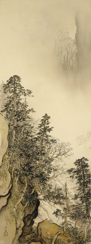 愛知に生まれ、岐阜で育った玉堂は、京都で望月玉泉、幸野楳嶺に師事したのち、23歳の年に東京に移り、橋本雅邦のもとでさらなる研鑽を積みました。玉堂は、京都で学んだ円山四条派の基礎の上に、雅邦が実践した狩野派的な様式を取り入れ、伝統的な山水画から近代的な風景画の世界へと画風を展開していきます。また、官展で審査員をつとめ、東京美術学校教授、帝室技芸員に任命されるなど、東京の画壇における中心的な役割を果たし、1940(昭和15)年には文化勲章を受章しました。