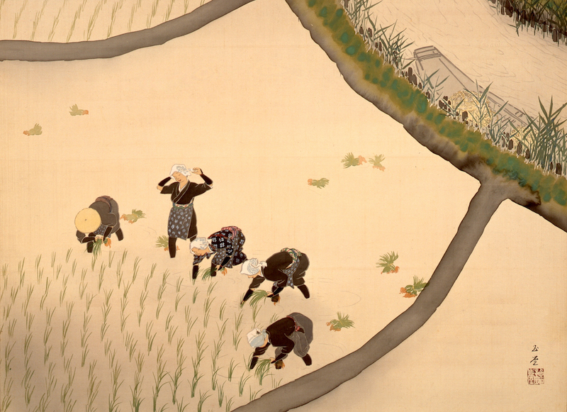 当館創立者である山﨑種二 (1893-1983) は、玉堂と親しく交流し、戦時中にもしばしば奥多摩の玉堂邸を訪れるほどの間柄でした。その縁から当館の所蔵となった玉堂作品は71点を数えます。本展では、初期の代表作である《鵜飼》、雅邦の影響が色濃い《渓山秋趣》などの明治期の作品から、古典的な筆法と写実的な風景表現を融合させた昭和初期の《石楠花》、自然とともに生きる人々の姿を穏やかに描き出した玉堂芸術の真骨頂ともいえる《春風春水》や《早乙女》、戦後の第1回日展に出品された《朝晴》まで、名品の数々とともに、玉堂の画家としての足跡をたどります。また、支援者であった山﨑種二、玉堂の師である望月玉泉や橋本雅邦、弟子の児玉希望など、玉堂をめぐる人々にも焦点を当て、交流がうかがえる作品やエピソードをご紹介します。
