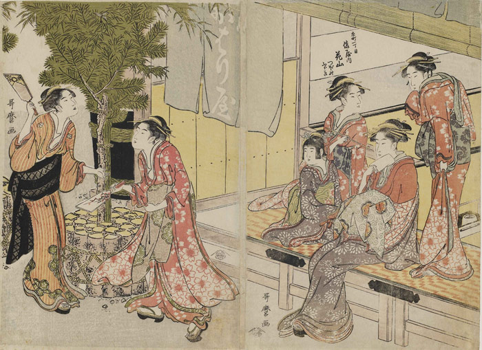 ![]() 喜多川歌麿≪吉原の正月 「京町一丁目 俵屋内 花山 つぼみ ふぶき」≫ ボストン美術館 所蔵 |