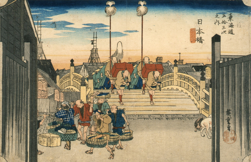 ![]() Utagawa Hiroshige I, Fifty-three Stations of the Tōkaidō Road: Nihonbashi (Morning Scene) ◇: 7/3-8/1 |